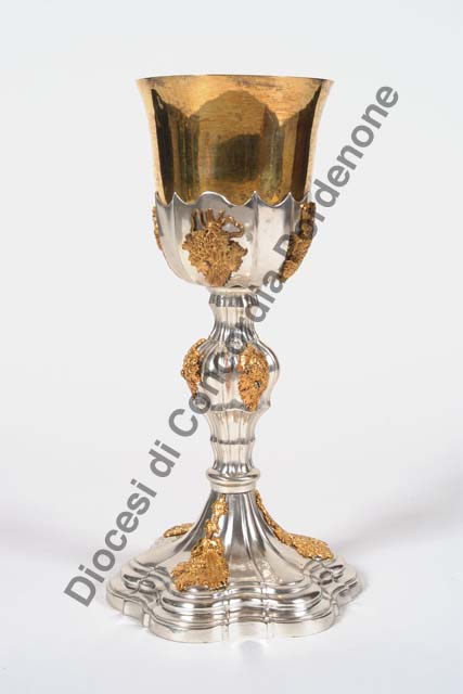 Il calice presenta piede gradinato mistilineo, suddiviso in spicchi di diversa dimensione da nervature che proseguono anche nel nodo sagomato del fusto e nella sottocoppa, entro la quale è inserita la coppa svasata completamente dorata. Piede, nodo e sottocoppa sono impreziositi da applicazioni dorate raffiguranti simboli eucaristici.
