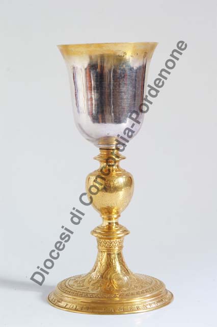 Il calice presenta piede circolare gradinato caratterizzato da una ricca decorazione costituita da nastri lisci intrecciati a formare motivi ad arabesco riempiti da piccole foglie, cui si aggiunge un medaglione ovale contenente la raffigurazione a incisione della Pietà. La stessa decorazione aniconica è riproposta nel nodo a vaso del fuso, il cui collo è mosso da baccellature concave. La coppa, settecentesca (come attestano i punzoni), è liscia e dorata all'interno e intorno al bordo esterno.