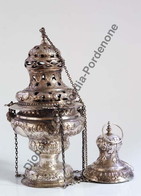 Il turibolo poggia su un piede a sezione circolare ornato da foglie alternate a cartigli ovali lisci; una decorazione che si ripete anche sulla coppa sagomata, conclusa da una gola a baccellature concave, sulla quale sono applicate testine angeliche a fusione dotate di anello per l'aggancio delle catenelle di sospensione. Nel coperchio sagomato il motivo decorativo già descritto viene riproposto a traforo, insieme ad altri costituiti da foglie contrapposte e alternate e da un nastro intrecciato. Foglie carnose avvolgono anche il piattello a campanula cui si raccordano le catenelle, dotato di anello apicale.