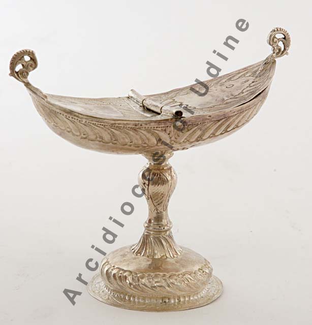 Piede circolare bombato, con largo labbro, sbalzato e inciso a motivi vegetali e stilizzati; nodo allungato, inciso a motivi fogliari; coppa a galeone con coperchio a due valve incernierato al centro e decorato con i medesimi motivi che compaiono sul piede