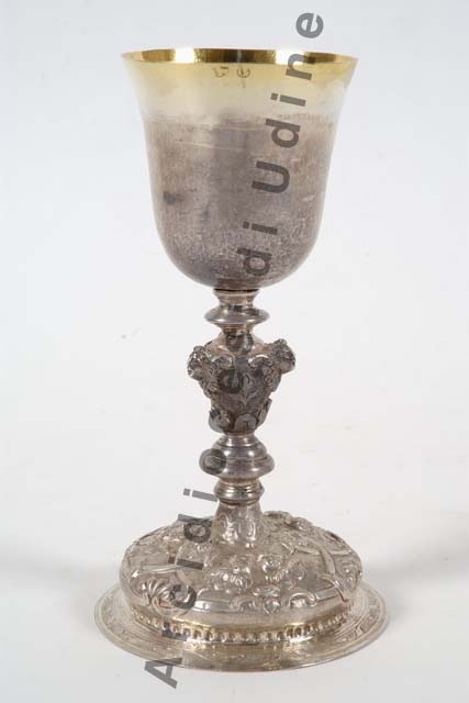 Il calice presenta piede circolare, con bordo piatto ornato da foglioline su fondo puntinato e corpo bombato, nel quale sono sbalzate coppie di testine di cherubino, separate da volute intrecciate contrapposte a una palmetta nella parte inferiore. Tre testine di cherubino aggettanti e foglie ornano anche il nodo piriforme del fusto, che sorregge una coppa liscia, svasata, dorata all'interno e lungo il bordo esterno.