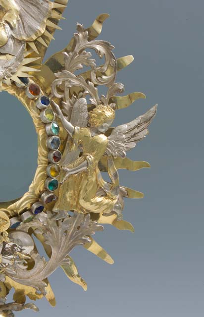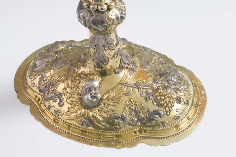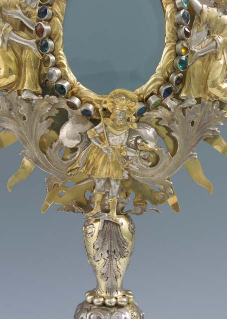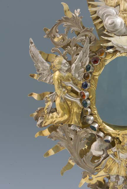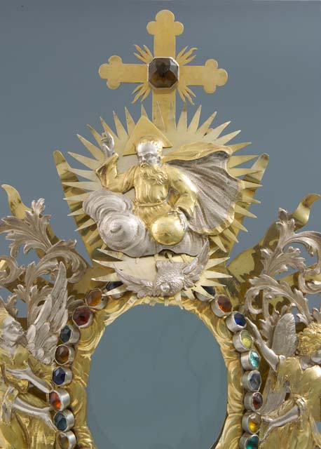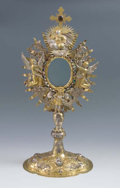 L'ostensorio presenta piede polilobato a sezione ellittica, con bordo liscio e corpo bombato decorato da testine di cherubino, festoni di frutta e motivi fitomorfi. Nel fusto si susseguono due nodi di diversa forma: il primo foggiato a nuvoletta con due testine di cherubino, il secondo sagomato, arricchito da motivi fogliari e nastri. Il ricettacolo racchiude una teca a luce ovale, circondata da nubi stilizzate sulle quali sono fissate pietre in pasta vitrea colorata. Sulla raggiera dorata, a raggi lanceolati, sono applicate grandi foglie d'acanto lavorate a giorno che separano le effigi di Sant'Osvaldo, raffigurato alla base con le insegne regali e il corvo con l'anello nel becco, di due angeli genuflessi ad ali spiegate, posti ai lati, e di Dio Padre benedicente accompagnato dalla colomba dello Spirito Santo sulla sommità, dove svetta una crocetta apicale impreziosita da una pietra ottagonale.
