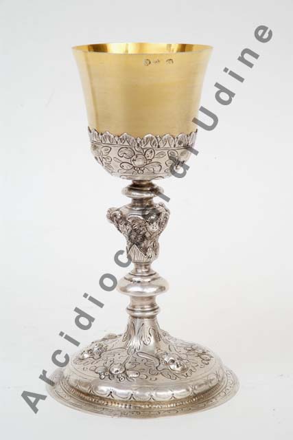 Piede circolare lievemente bombato, con labbro, sbalzato e inciso con testine di cherubino tra festoni di frutta; nodo sagomato a sezione circolare, con testine angeliche aggettanti; sottocoppa ornato con i medesimi motiviche compaiono sul piede, coppa liscia a campana.