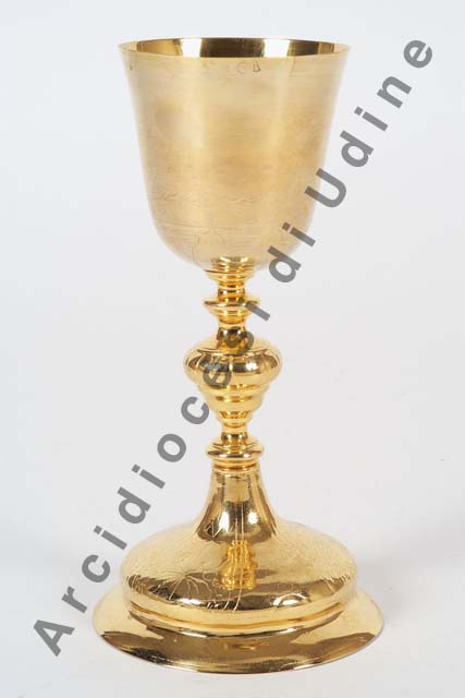 Calice a base circolare liscia con piede leggermente schiacciato, diviso in sei parti ornate da teorie di foglie e bacche che si alternano a superficie liscia. Elementi di raccordo torniti racchiudono il nodo inciso a elementi fitomorfi. Calice con incisa alla base una corolla di foglie mistilinee sormontate da un festone di foglie e bacche che percorre tutta la larghezza del calice.