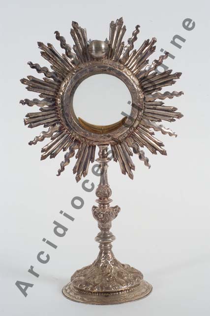 Piede circolare bombato, con orlo piatto, sbalzato con angeli recanti i simboli della Passione di Gesù Cristo tra foglie d'acanto; nodo piriforme, ornato da testine angeliche aggettanti, ricettacolo raggiato, con teca a luce circolare, ornata da testine cherubiche fra nubi e sormontata da globo.