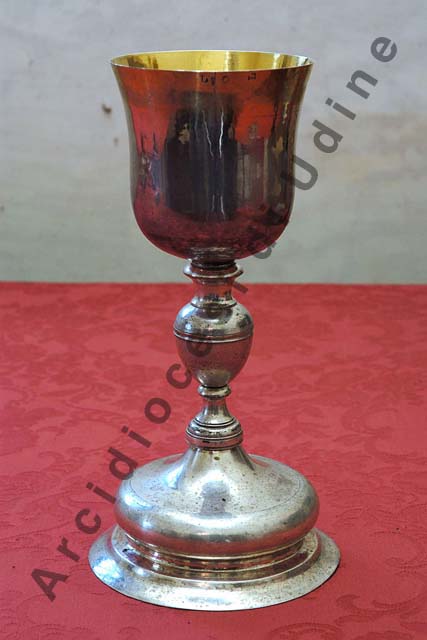Il calice presenta piede circolare con bordo gradinato e corpo bombato, fusto con nodo a vaso, coppa liscia completamente dorata.