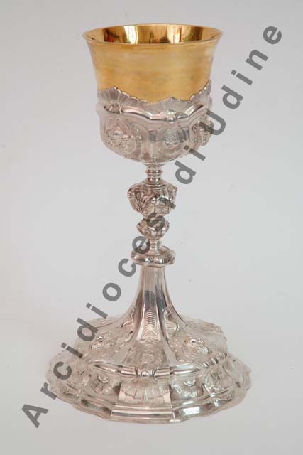Il piede a profilo mistilineo suddiviso da costolonature a rilievo presenta modanature concave e convesse decorate da motivi fitomorfi e testine cherubiche. Su un primo nodo a sezione ottagonale si innesta il nodo principale a sezione trinagolare decorato a cartouches. Sottocoppa decorata a rilievo.