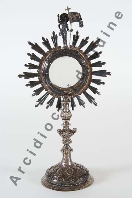 L'ostensorio presenta piede a sezione circolare con orlo percorso da racemi e corpo bombato, ornato da nastri lisci con motivi vegetali e coppie di testine angeliche. Il fusto è formato da un nodo sagomato mosso da testine di cherubino aggettanti, seguito da un balaustro avvolto da cespo fogliaceo. L'ampia teca a luce circolare è circoscritta da una cornice sbalzata con finti castoni e testine angeliche tra nubi stilizzate; le stesse si intercalano ai fasci di raggi della raggiera, che lasciano posto sulla sommità alla figuretta a tutto tondo di Cristo risorto benedicente, sorreggente il vessillo crocesignato.