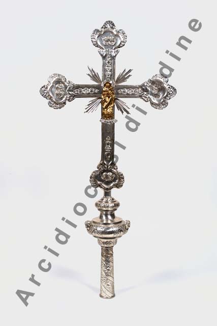 La croce presenta innesto sul quale si avvolge a spirale un nastro dai bordi lisci ornato internamente da fiori, foglie e grappoli d'uva; nodo sagomato sul quale sono applicate testine angeliche aggettanti circondate da fiori e foglie, alternate a medaglioni lisci, mentre la parte inferiore e superiore sono decorate da foglie cui, nella seconda, si uniscono dei fiori. I bracci, ornati da un motivo con un fiore a corolla affiancato da foglie, sono profilati da una cornicetta modanata che si apre in una duplice foglia in corrispondenza delle terminazioni trilobate, ricoperte esternamente da festoni di fiori disposti a lato di una palmetta centrale. All'interno esse ospitano, sul recto, angeli adoranti l'ostensorio dorato centrale; sul verso, coppie di testine cherubiche disposte intorno alla placchetta dorata della Madonna con il Bambino in braccio, stante sopra una testina angelica.