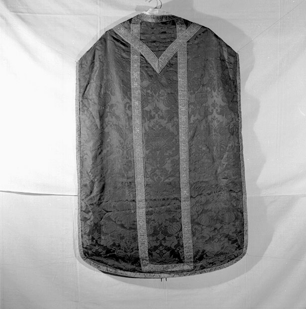 La pianeta a fondo fucsia, di taglio tradizionale, reca lo stolone e lo scollo guarniti da un gallone coevo con ordito di seta gialla e oro filato, che slegando a modo di alluciolatura, disegna un motivo rombolidale disposto in un campo quadrangolare definito da lunghe slegature d'ordito. Un galloncino dello stesso tipo borda lateralmente il manufatto che ha la fodera coeva in tela di lino grezzo cucita a mano.