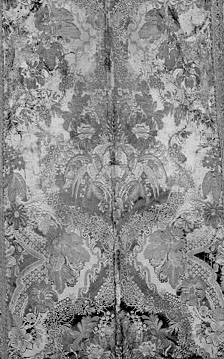 Paramento liturgico composto da due tunicelle, un manipolo e una stola confezionati con un tessuto dal decoro dall'impianto centrale speculare. Su fondo beige scuro una grande maglia disegnata da un tralcio ondulante con grappoli violetti e foglie di vite verdi, racchiude al centro un elegante nucleo vegetal floreale di colore verde e giallo, sovrastato da fiori rosa e violetti e da bacche avorio. Ai lati una gialla trina testurizzata, sulla quale sono sovrapposti fiori e foglie degli stessi colori. Galloni in seta gialla e oro filato, fodere in tela di lino color cipria chiara. Stola e manipolo presentano giunture di altro tessuto.
