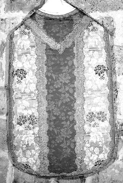 L'impianto compositivo e certi elementi decorativi richiamano a tessuti francesi degli anni 1730-45; ma i manufatti sono attribuibili a manifattura tedesca o austriaca del periodo indicato poichè coincidono il tipo di cimosa, i materiali ed i colori, la tecnica e il disegno piuttosto grossolani (cfr. Markowsky ). Il tessuto che nella pianeta forma gli stoloni è costituito da filati di cotone ed è realizzato intorno agli anni 40-50 di questo secolo.