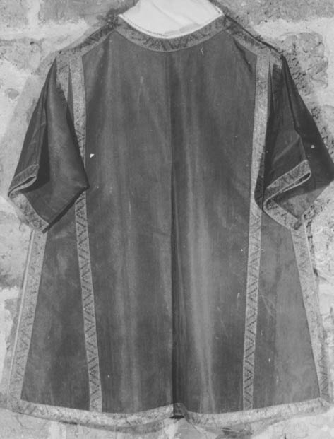 Tunicella confezionate con un tessuto unito color marron tabacco cangiante e foderate con tela di lino beige. Sono costituite, sia davanti sia dietro, da due teli centrali uniti visibilmente in verticale a due di taglio triangolare, le maniche sono ognuna di due pezzi, decorata da galloni in oro lamellare e seta gialla con motivo a losanghe creanti zigzag.