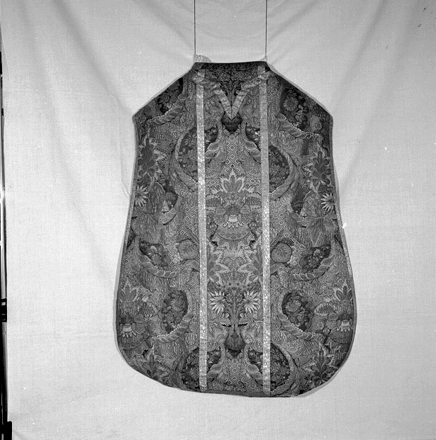 La stoffa, riciclata, è della tipologia definita "a pizzo" prodotta in Francia e in Italia negli anni che vanno dal 1690 al 1730.