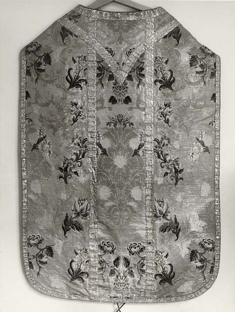 Pianeta con fondo di colore giallo oro dalla forma tradizionale evidenziata da un gallone con ordito di seta gialla, trama in oro filato le cui slegature disegnano due foglie lanceolate abbinate, disposte in diagonale e un minuto fiore a sei petali nel centro. La fodera di taffetas rosso è cucita a macchina.