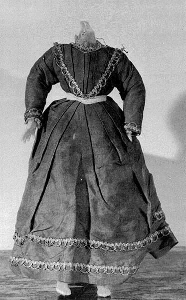 L'abito, in taffetas di seta azzurra, è costituito da corpetto e gonna ed è corredato da un velo (25x67 cm). Il corpetto, aperto dietro, è ripreso alla spalla da pieghe che scendono sciolte fino alla vita segnata da una cinturina (0.5 cm) in raso rosa con fiocco posteriore. Il girocollo rotondo è profilato, come le maniche lunghe, da una trina (1.2 cm) in oro filato S su anima di seta e argento con motivo a cappette, la stessa che sul davanti, partendo dal centro vita, guarnisce il corpetto formando un motivo a V. Nella medesima linea la gonna, costituita da un telo davanti e due dietro e valorizzata in basso da un duplice rango della stessa trina. Solo le maniche sono foderate in tela di cotone bianca, come la sottogonna (27 cm) arricciata in vita, ornata sul fondo da un pizzo meccanico (3 cm). La camicia in cotone bianco, ha i polsi bordati da un sottile nastro di raso rosa, arricchito dallo stesso pizzo a fuselli in cotone (1.5 cm) che si ritrova allo scollo. Completano l'abbigliamento, mutande lunghe sino alla caviglia, nella stessa tela della sottogonna, rifinite con la medesima trina della camicia. Tutti gli indumenti sono cuciti a mano.