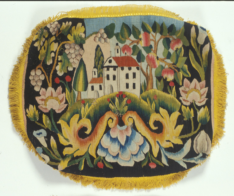 Collocabili alla metà del Settecento per la predilezione e l'accostamento delle tinte sfumate ma vivaci (raffinatissimo l'accostamento del rosa ai i verdi) e per l'influenza esercitata dal gusto per l'esotico (v. i cipress i, la conchiglia, etc.) reso con intento naturalistico, esprimono un gusto ingenuo, quasi infantile, molto vicino alle raffigurazioni naiv, che cara tterizza anche altri manufatti realizzati nel monastero databili al pieno Settecento. Una attività che integrava le entrate del Monastero intorno al la metà del Settecento, oltre a quella dei fazzoletti, era anche la confez ione di coprisedile, verosimilmente ad arazzo come gli esemplari conservat isi. L'archivio infatti registra nel 1743 una entrata di '35 fiorini per Fattura di 12 sedili', data che concorda stilisticamente con il decoro dei manufatti.