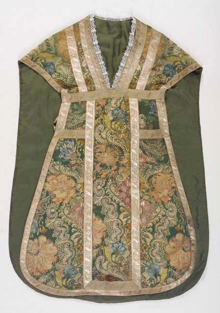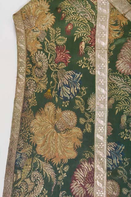 Confezione ottenuta assemblando otto frammenti di stoffa posizionati specularmente nei laterali. Galloni sostituiti, di due dimensioni con medesimo decoro, in argento filato su anima di seta bianca a nastro sinuoso intercalato da un fiorellino a sei petali; il profilo del collo è marcato da doppio gallone e da una trina a fuselli. Fodera rinnovata recentemente, in taffetas verde cucita a macchina; rinforzo interno in tela di canapa.