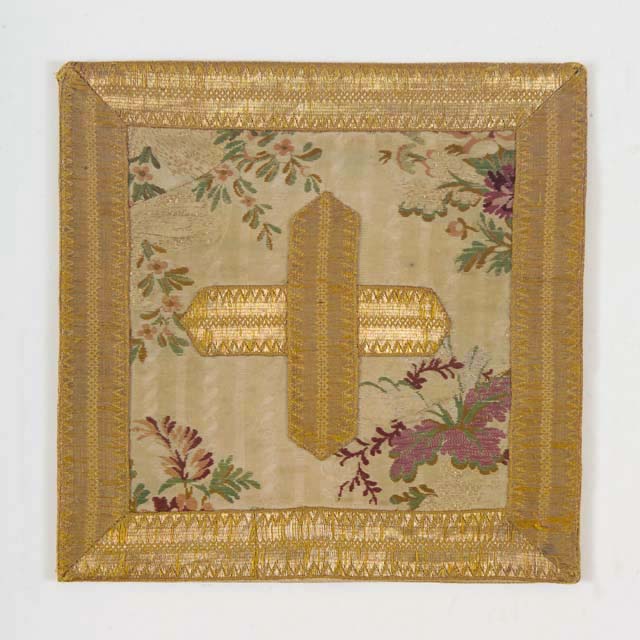 La tipologia tecnica e disegnativa di questo tessuto si inserisce nel genere definito “a meandro”, formato da linee serpeggianti articolate a tralci fioriti svolti in senso naturalistico. Tale schema decorativo è in uso a partire dal quarto decennio del Settecento e si protrasse fino al 1770. La lavorazione del controfondo, che suggerisce le righe di fine secolo, giustificano la datazione indicata.