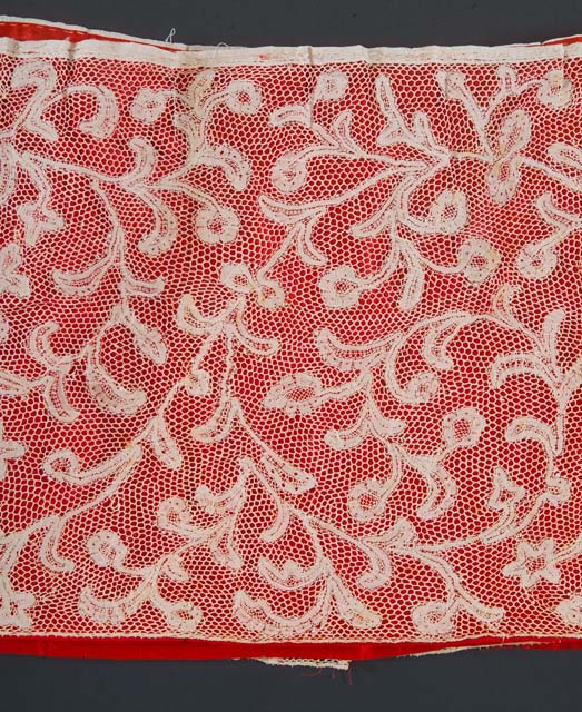 La balza, staccata presumibilmente da un ampio camice, è confezionata con due pezzi di merletto giunti a mano. Quest'ultimo, fissato nella parte superiore e inferiore su un supporto in taffetas rosso, presenta disegni definiti da un nastro vegetale fronzuto a girali decisi e ravvicinati, realizzati a punto tela su una rete di fondo a maglie romboidali.