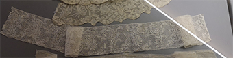 Merletto a fuselli a fili continui, motivi in punto tela con trafori, riempitivi con ragnetti anche forati, fondo a cinque buchi, piede in punto tela, bordo esterno con picot. Motivi di fregi e cornucopie slanciati incorniciati da vegetali, legati l'una a l'altro disposti a zig zag.