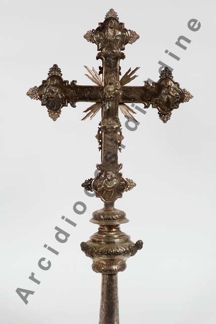 Innesto inciso con foglie d'acanto presenti anche sul pomo sagomato ornatocon testine di cherubini aggettanti; croce raggiata con terminali a compasso mistilineo, profilata lungo i bracci da placchette ornamentali traforate recanti motivi vegetali e testine angeliche. Sul recto, al centro, GesùCristo crocifisso, a sinistra San Marco, in alto un santo papa benedicente, a destra San Matteo e in basso la Maddalena; sul verso, al centro, la Madonna con il bambino, a sinistra la Madonna, in alto San Giovanni Evangelista, a destra San Giovanni e in basso Santa Lucia