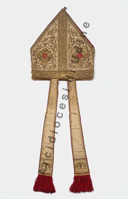 Il profilo inferiore del manufatto è rifinito da un piccolo nucleo vegetale che genera due steli ondulanti disposti a girale, simmmetricamente affrontati. Uno stelo dello stesso tipo divide l'oggetto in verticale creando due comparti speculari nei quali è disposto un fiore a quattro lobi, inserito in una stella. Nel fondo è presente un fitto decoro vegetale, tutto dorato, ad esclusione delle quattro fogliette che completano il fiore, realizzate a punto pieno con seta verde. Il resto del decoro è ottenuto da ricamo e applicazioni di oro filato e oro riccio su anima di seta avorio.