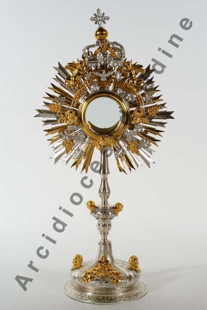 Piede circolare dotato di gola e bordo, decorato con elementi vegetali e testine angeliche applicate, riprese anche sul nodo a vaso sbalzato a foglie d'acanto; esile fusto rastremato verso l'alto, ricettacolo raggiato conapplicazioni di tralci di vite e testine angeliche. Nella parte superiorebaldacchino sorretto da due angiolini sotto cui è posta la Colomba dello Spirito Santo. Alla sommità globo con crocetta apicale raggiata