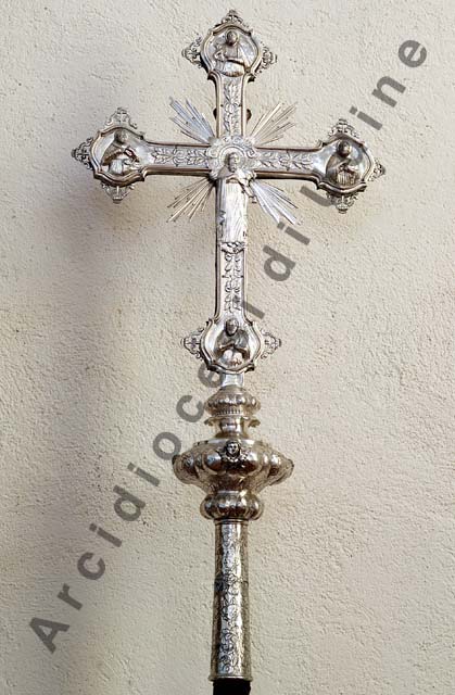 Innesto inciso con motivi fogliari presenti anche sul pomo sagomato e sbalzato a bugne, con testine cheruniche aggettanti. Croce raggiata con terminali a compasso mistilineo profilati da applicazioni traforate di elementivegetali. Sul recto Gesù Cristo crocifisso e i simboli dei quattro Evangelisti sui terminali; sul verso, al centro, Sant'Antonio Abate e, alle estremità, San Domenico, San Pietro, San Giuseppe e un santo vescovo non identificabile