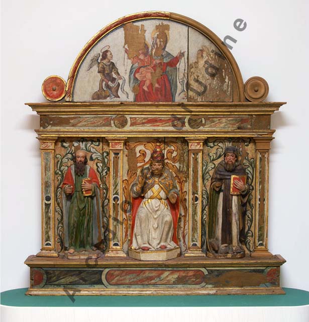 Ancona tripartita costituita da tre nicchie ospitanti le statue dei santiPietro, Paolo e Antonio Abate. Sopra la traeazione si erge la cimasa arcata racchiudente la raffigurazione della Madonna del rosario con Gesù Bambino tra angeli