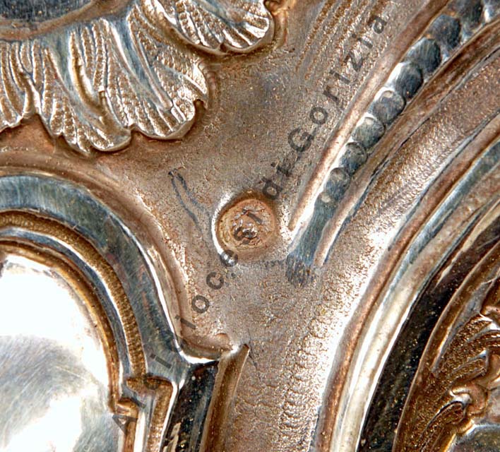 La sagomatura in legno visibile solo sul retro, regge una lamina dal profilo mistilineo poggiante su piedini a voluta, definita da volute, elementirocaille, testine alate alla sommità e due cartigli rispettivamente con l'immagine di un Santo e la data.
