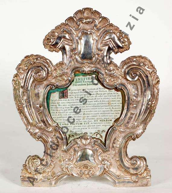La sagomatura in legno visibile solo sul retro, regge una lamina dal profilo mistilineo poggiante su piedini a voluta, definita da volute, elementirocaille e scudi.
