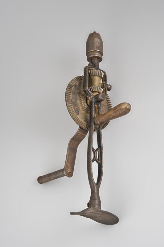 Macchina utensile che si sviluppa in senso verticale, composta da un corpo centrale in ferro sagomato e provvisto di impugnatura in legno disposta in senso perpendicolare all'asse. A questo è collegata, tramite un cilindro di trasmissione, la ruota dentata azionata da una manovella in ferro. L'utensile termina inferiormente con un attacco conico per l'inserimento della punta, mentre l'estremità superiore presenta una base d'appoggio piatta e di forma ovale.