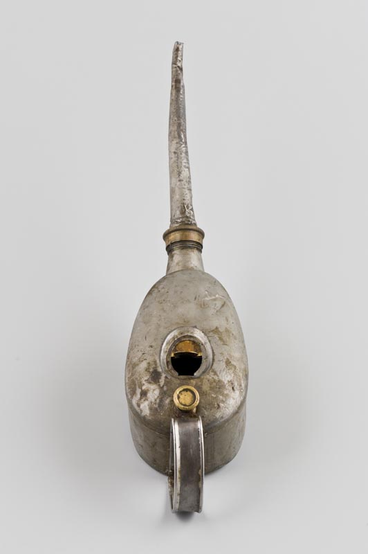 Basso contenitore di forma ovale con coperchio munito di un foro apribile, per l'inserimento del lubrificante, e di un pulsante di regolazione; dotato di lungo beccuccio di erogazione e impugnatura a maniglia.