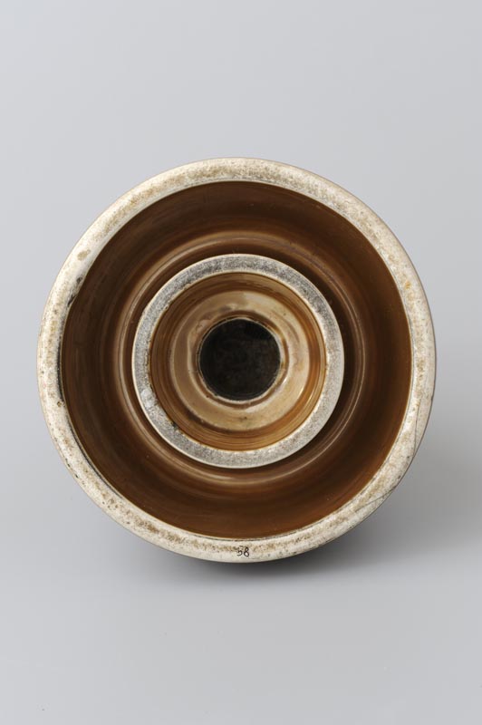 Oggetto dal corpo troncoconico di color ocra, fortemente rastremato, provvisto interenamente di anello di rinforzo e dotato di terminazione superiore a bottone con profondo incavo per l'alloggiamento del cavo conduttore. Il foro di fissaggio è rivestito con una lega di stagno filettato.