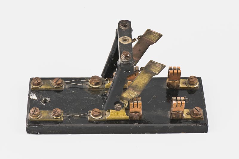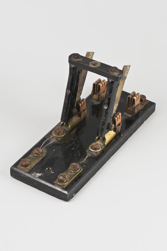 Oggetto composto da una base di appoggio rettangolare in marmo, che presenta una staffa mobile collegata alla leva di azionamento (qui mancante). Sulla staffa, verso l'interno, sono fissati i contatti mobili del sistema, costituiti da due lamine di stagno, variamente sagomate. I contatti fissi sono costituiti da quattro morsetti ottenuti da lamine di rame ripiegate, fissate direttamente alla base di marmo. I fili in entrata e in uscita del circuito elettrico sono fissati alle quattro piastrine di stagno che aderiscono direttamente alla base tramite sei grandi bulloni in ferro. Una volta fissato al macchinario o al quadro di comando, l'unica parte visibile è la leva di azionamento.
