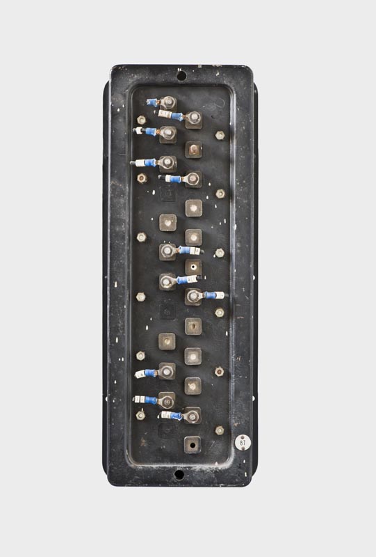 Contenitore a forma di parallelepipedo di colore nero, con la faccia anteriore in vetro trasparente, dotata di bordo metallico con otto fori per il fissaggio a parete. Dalla faccia posteriore sporgono dodici lunghe viti predisposte per i collegamenti elettrici, mentre altre nove basi possono essere utilizzate a tale scopo. Internamente sono collocati i tre dispositivi di controllo meccanico (relativi alle tre fasi), costituiti da diversi elementi metallici.