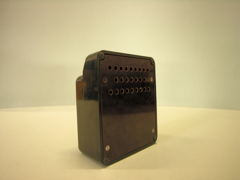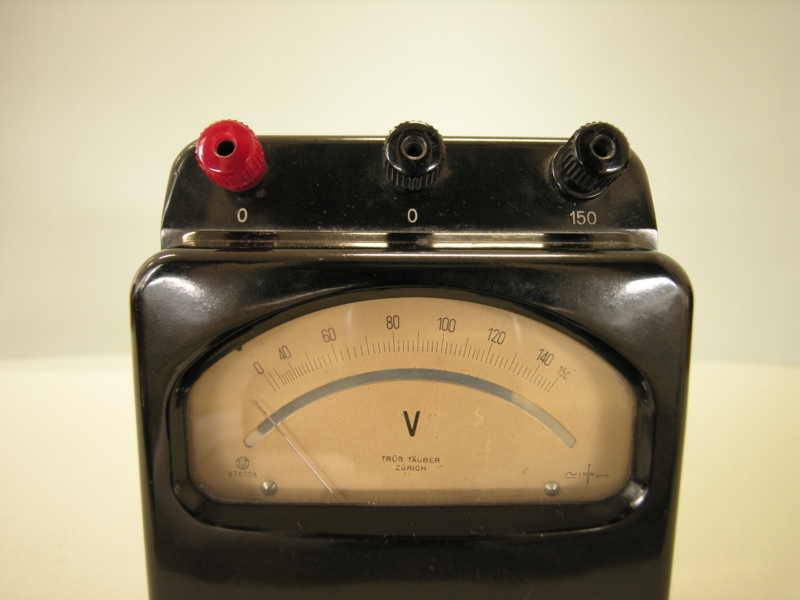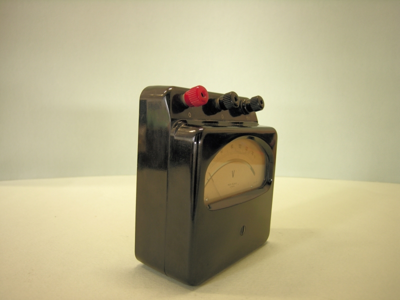 Oggetto a forma di parallelepipedo, realizzato in plastica di colore nero, con faccia posteriore in compensato e provvista di quattro piedini angolari di appoggio. Anterioremente è stato ricavato il quadrante di lettura della misurazione, grazie ad una finestra in vetro trasparente. Sul quadrante di misurazione la scala va da 0 a 150 V. Sopra il quadrante, direttamente a contatto con il corpo dello strumento, sono posizionati, in modo equidistante tra di loro e verticalmente rispetto al piano di appoggio, i tre spinotti per il collegamento con i cavi elettrici degli strumenti da rilevare. Gli spinotti, alla base, presentano ciscuno delle indicazioni di rapporto (0, 0 , 0); sono costituiti da una vite fissa, filettata, e da una rotellina, avvitabile a seconda delle necessità, realizzata in acciaio con rivestimento di plastica, una delle rotelline e' di colore rosso. Venticinque fori di aerazione, disposti ordinatamente su tre righe, si trovano sul lato posteriore dello strumento.
