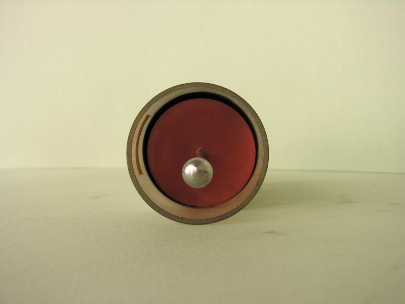 Bicchiere di vetro cilindrico, rivestito esternamente in alluminio, ha al suo interno un disco di gomma posizionato orizzontalmente. Il disco ha un foro centrale in cui è inserita un'asticella metallica cilindrica, che termina superiormente con una sfera e inferiormente con un piccolo disco metallico.