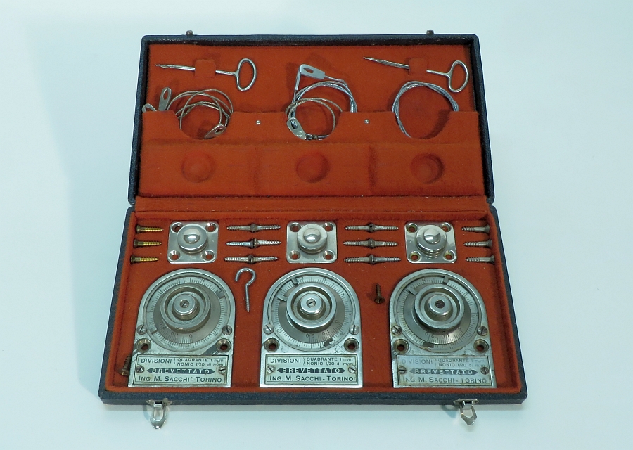 riquadro nella parte inferiore dello strumento: divisioni: quadrante 1 m/m - nonio 1/20 m/m / BREVETTATO / ing. M. Sacchi - Torino