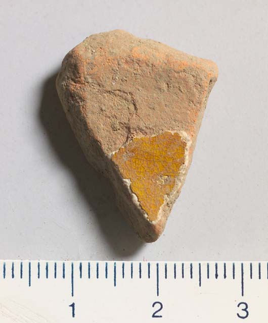 Frammento di tesa di piatto con ingobbiatura bianca e invetriatura giallo ocra. Argilla arancione, impasto quasi privo di inclusivi.