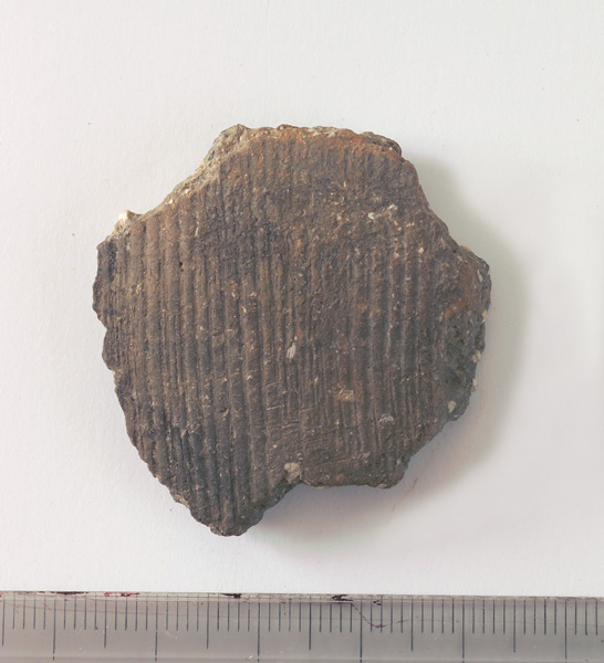Frammento di parete di vaso decorato a linee incise orizzontalmente. Impasto grigio-marrone con pareti color nocciola. Nella superficie interna sono presenti i segni della lavorazione al tornio. Nell'impasto sono presenti inclusivi biancastri e, più piccoli, brillanti.