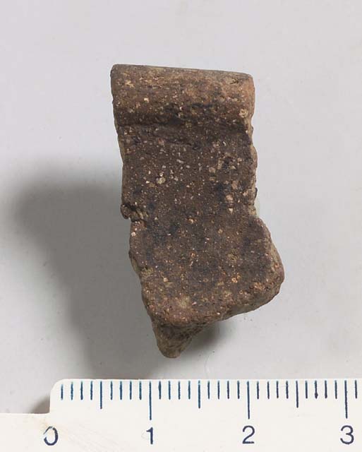Frammento di bordo estroflesso con labbro ingrossato di olla. Impasto nerastro con inclusivi biancastri.