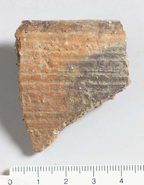 Frammento di labbro diritto con orlo ingrossato, di grande ciotola con impasto bruno-arancio con segni del tornio all'interno e decorazione "a pettine" all'esterno. Fitti inclusivi silicei.