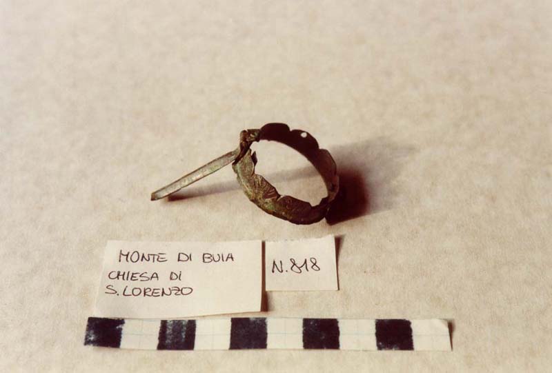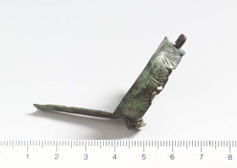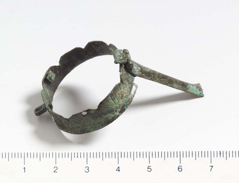 Ghiera in lamina battuta con inciso motivo decorativo a palmette . Asticella sovrapposta e fermata con ribattino da un lato, occhiello a sezione rettangolare fissato sul lato diametralmente opposto.