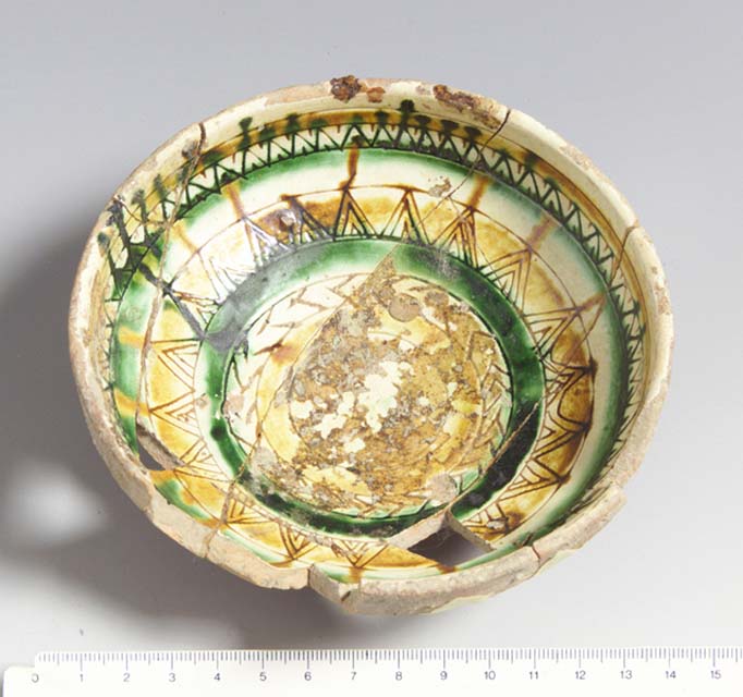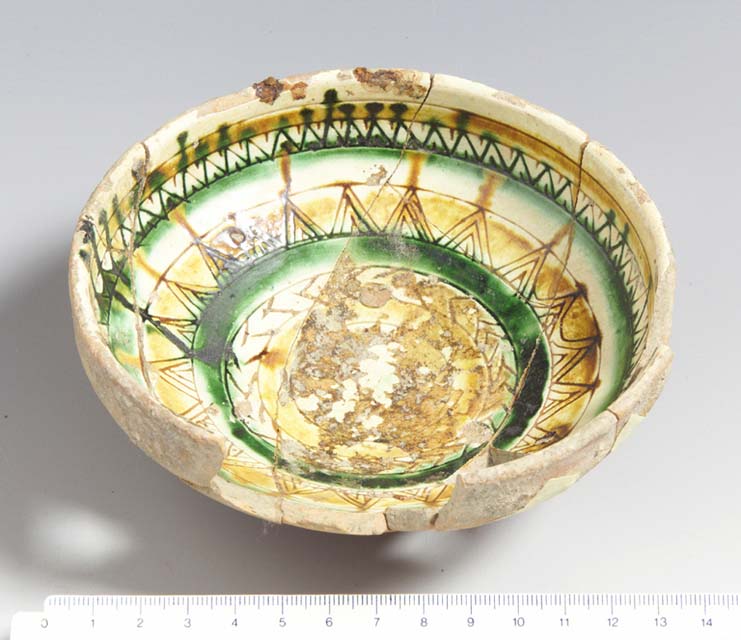 Scodella in ceramica dipinta e graffita su ingobbio sotto vetrina sulla parete interna, l'esterna è grezza. L'ornato geometrico graffito è composto da cerchi concentrici che racchiudono un decoro a spina di pesce e due sequenze di triangoli di cui una con triangoli racchiusi uno entro l'altro. Il colore di fondo è avorio con fasce gialle alternate a verdi. La scodella ha fondino umbonato con cercine trapezoidale, bordo estroflesso con orlo convesso.
