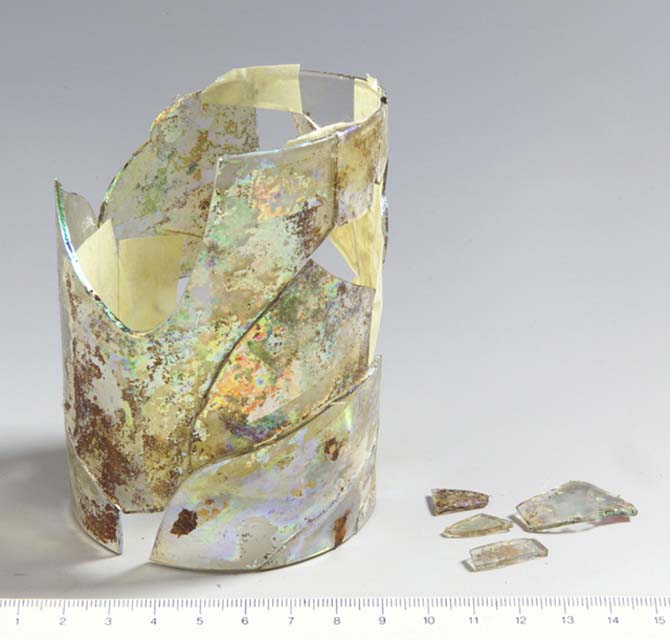 Teca di reliquario cilindrica dagli orli leggermente arrotondati in vetro trasparente fortemente ossidato formata da 19 frammenti ricomposti.