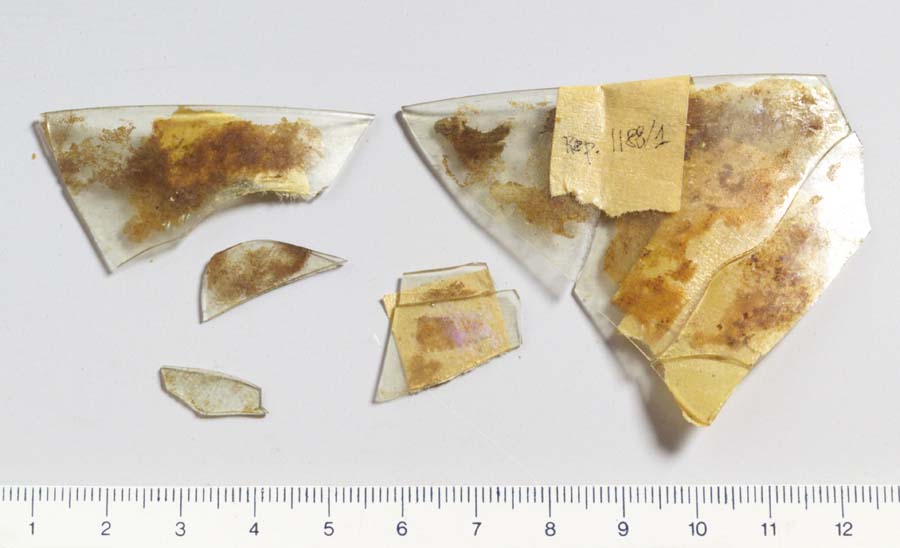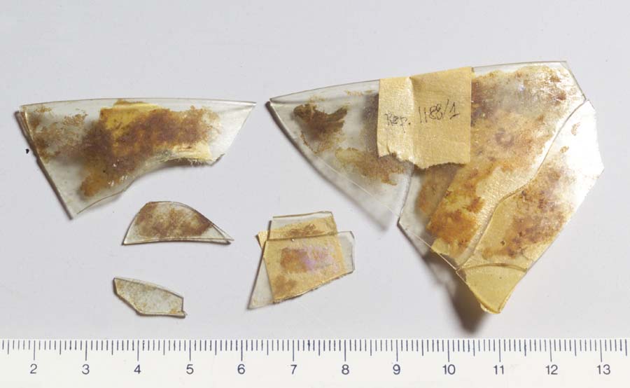 Dieci frammenti di coppa in vetro leggermente verdinocon sottili bolle. Parete leggermente svasata e orlo diritto.