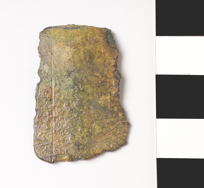 Il frammento di lama di pugnale, a sezione romboidale appena rilevata decorata da solcature parallele ai margini, è genericamente accostabile a tipi di pugnali diffusi in Italia settentrionale nel Bronzo medio e recentei