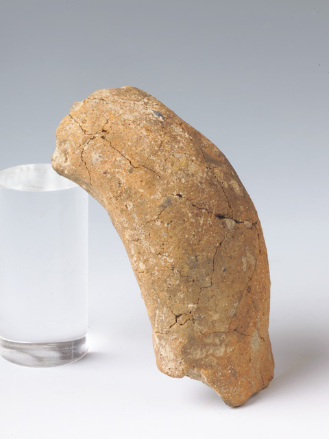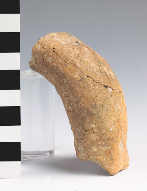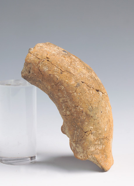 Ansa a maniglia orizzontale, a bastoncello a sezione quadrangolare spessa, frammentaria, profilo semicircolare prominente; impostata su parete arcuata. Impasto semigrossolano ricco di inclusi calcitici, superficie lisciata grigiastra